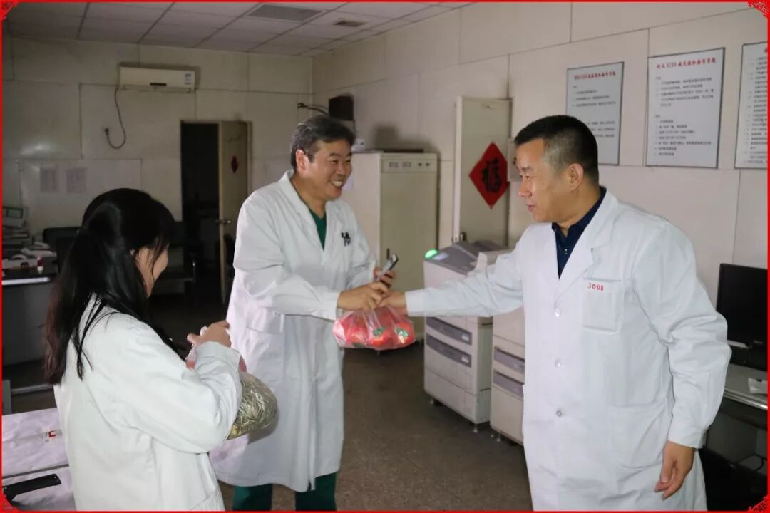 23时许,杜宏伟院长、张彬副院长、孙国伟副院长前往科室慰问,院办主任肖晖、保卫科科长孙华宝、总务科科长徐建华、范德利、保安队队长陈立忠、食堂负责人赵玉龙陪同。每到一处,院领导与坚守岗位的职工亲切握手交谈,感谢他们为医院的发展、为患者的健康辛勤工作所做出的奉献,向他们表达敬意,致以节日的问候,将准备的节日慰问品送到大家手中,并祝他们新春愉快,阖家欢乐。
