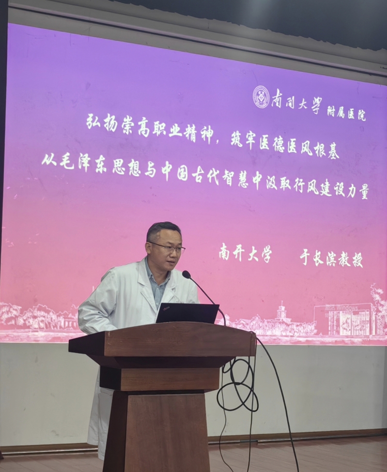 于长滨报告的主题是“弘扬崇高职业精神,筑牢医德医风根基——从毛泽东思想与中国古代智慧中汲取行风建设力量”。他结合医疗工作者承担的责任使命和面临的形势任务,从四个方面对如何以毛泽东思想为指引加强医疗卫生队伍作风建设展开了生动解读,他说“全心全意为人民服务”的根本宗旨是医务工作者应当内化于心的职业信仰,“实事求是”的思想路线引导医护人员在医疗实践中严谨求精、尊重科学,“艰苦奋斗”的作风激励医务工作者在困难面前勇于担当、甘于奉献,“密切联系群众”的传统提醒我们始终以患者需求为导向,构建信任、温暖的医患关系。同时,他还结合中国古代思想,强调医德医风建设需扎根传统、面向未来,做到知行合一。